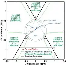 For three stations, multilateration accuracy is quite good within almost the entire triangle enclosing the stations—say, 1 < HDOP < 1.5 and is close to the HDOP for true ranging measurements using the same stations. However, a multilateration system's HDOP degrades rapidly for locations outside the station perimeter. Figure 5 illustrates the approximate service area of two-dimensional multilateration system having three stations forming an equilateral triangle. The stations are M-U-V. BLU denotes baseline unit (station separation ). The inner circle is more 'conservative' and corresponds to a 'cold start' (no knowledge of vehicle's initial position). The outer circle is more typical, and corresponds to starting from a known location. The axes are normalized by the separation between stations.