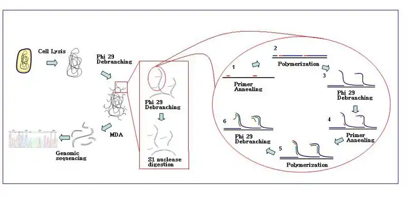 The amplification reaction initiates when multiple primer hexamers anneal to the template. When DNA synthesis proceeds to the next starting site, the polymerase displaces the newly produced DNA strand and continues its strand elongation. The strand displacement generates newly synthesized single stranded DNA template for more primers to anneal. Further primer annealing and strand displacement on the newly synthesized template results in a hyper-branched DNA network. The sequence debranching during amplification results in high yield of the products. To separate the DNA branching network, S1 nucleases are used to cleave the fragments at displacement sites. The nicks on the resulting DNA fragments are repaired by DNA polymerase I.