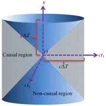 For simplicity, consider only one spatial dimension x3 and the two time dimensions x1 and x2. (E. g., x1 = ct1, x2 = ct2, x3 = x.) Assuming that in point O, having coordinates x1 = 0, x2 = 0, x3 = 0, there has been an event E. Further assuming that a given interval of time has passed since the event E, the causal region connected to the event E includes the lateral surface of the right circular cone {(x1)2 + (x2)2 − (x3)2 = 0}, the lateral surface of the right circular cylinder {(x1)2 + (x2)2 = c2ΔT2} and the inner region bounded by these surfaces, i.e., the causal region includes all points (x1, x2, x3), for which the conditions