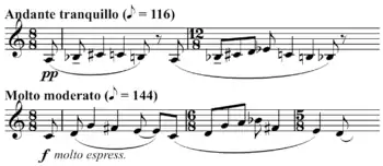 In this example, a set of three pitches multiplied with a set of two pitches gives a new set of 3 × 2 pitches. Given the limited space of modulo 12 arithmetic, when using this procedure very often duplicate tones are produced, which are generally omitted. This technique was used most famously in Boulez's 1955 Le marteau sans maître, as well as in his Third Piano Sonata, Structures II, "Don" and "Tombeau" from Pli selon pli, Eclat (and Eclat multiples), Figures-Doubles-Prisms, Domaines, and Cummings ist der Dichter, as well as the withdrawn choral work, Oubli signal lapidé (1952) (Koblyakov 1990, 32; Heinemann 1993; Heinemann 1998). This operation, unlike arithmetic multiplication and transpositional combination of set classes, is non-commutative (Heinemann 1993, 24).
