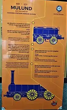 Mulund station was built to serve the suburb of Mulund, which was laid out in the 1920s. In the 1970s a new goods terminal was constructed at Mulund to handle increased volumes of freight. On 13 March 2003 a bomb exploded on a train pulling into Mulund station at 21:45 hrs. 10 people were killed and 70 injured.[1]