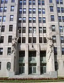 Although the Skyscraper features abstracted foliate, sunbursts, and other geometric designs around its doors and windows, the most striking feature of the building's exterior is its guardian angels. The two towering statues at the entrance represent the angels Uriel ("Light of God") and Jophiel ("Beauty of God"). Uriel holds the book of wisdom and points to a cross in Bas-relief on the fourteenth floor. Jophiel holds the planet Earth and lifts the torch of knowledge.[13]