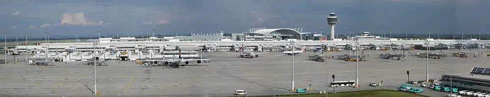 Munich Airport (German: Flughafen München) (IATA: MUC, ICAO: EDDM) is the international airport of Munich, the capital of Bavaria. It is the second-busiest airport in Germany in terms of passenger traffic after Frankfurt Airport, and the ninth-busiest airport in Europe, handling 47.9 million passengers in 2019.[5] It is the world's 15th-busiest airport in terms of international passenger traffic,[6] and was the 38th-busiest airport worldwide in 2018.[7][8] Munich Airport serves as a hub for Lufthansa including Lufthansa CityLine and its Star Alliance partners.