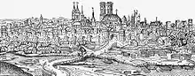 German historian, Hartmann Schedel, printed a view of Munich including the unfinished towers in his famous Nuremberg Chronicle, also known as Schedel's World Chronicle. Finally, because rainwater was regularly penetrating the temporary roofing in the tower's ceilings, the towers were completed in 1525, albeit using a more budget-friendly design. This new design was modelled after the Dome of the Rock in Jerusalem, which itself was modeled from late Byzantine architecture and erroneously considered to be Solomon's original temple.[3] The resulting domes atop each tower contributed to making the church a distinctive Münichian landmark.