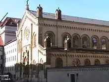 Facing the church, the Marstall, the building for the former Court Riding School (Hofreitschule) was erected under King Maximilian Joseph by Klenze between 1817 and 1822. The construction of the monumental portal arch, surmounted by busts of Castor and Pollux, is considered one of the most mature early works of Klenze. The extensive buildings for the royal stables do not longer exist. From 1923 the Marstall housed the Marstallmuseum which was in 1941 moved into Nymphenburg Palace. Today the building serves as scenery house, workshop building and study stage of the Residenz Theatre.