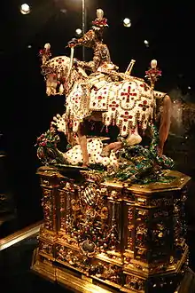 Among the exhibits are Emperor Charles the Bald's prayer-book from around 860, the altar-ciborium of Emperor Arnulf of Carinthia from around 890, the crown of the Empress Cunigunde, reliquary of the True Cross which belonged to the Emperor Henry II, a cross which belonged to Queen Gisela, all from around 1000, the Reliquary Crown of Henry II from around 1270, an English Queen's crown from around 1370 (the oldest surviving crown of England that came to the palatinate line of the house of Wittelsbach as the dowry of Blanche of England, the daughter of King Henry IV of England), the famous Statuette of St George (Munich, ca. 1599), the insignia and orders of the Bavarian monarchs, including crowns and insignia of the Emperor Charles VII (1742), the Crown of Bavaria (1807), ceremonial swords and ruby jewellery which belonged to Queen Therese. A precious set of matching dishes served the French Empress Marie Louise during her journeys. Non-European art and craftwork, including Chinese porcelain, ivories from Ceylon and captured Turkish daggers are also on display.