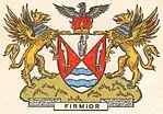 Granted on 1 September 1932, the borough's coat of arms was: Per saltire argent and gules in chief a representation of St. Nicholas proper in base two bars wavy azure and in fesse as many seaxes (Saxon swords) the cutting edges inwards proper pommels and hilts or. Crest : Issuant out of a Saxon crown or a phoenix sable in flames proper. Supporters : On either side a griffin or gorged with a collar gemel wavy azure.[1]