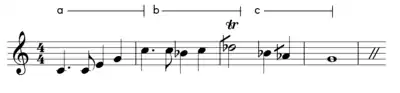 The C-major arpeggio (motif a) that opens the piece would be an extra banal phrase in European music, but played on the oud it represents a totally unusual musical gesture, because there are no such major triads of that form used in Arabian music. Then the playing around the note C (motif b) points to the musical connotation (Andalusia, for centuries a province of the caliphate, and homeland of the flamenco), that was intended by the composer. With the help of only two notes (D♭ and B♭) the major triad changes into the Phrygian mode that is very typical for the flamenco, whereas the tremolo-like ornamentation of the leading D♭ supports this effect. Then the line descending to G (motif c) establishes the key for the further improvisations. This key is called maqam Hijaz Kar Kurd and has the following (simplified) structure: