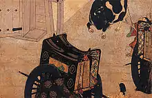 The cultural changes after the Heian period resulted in a more realistic depiction of figures including movements and gestures.[7] Abandoning the Heian period hikime kagibana style ("slit eyes, hooked nose"),[nb 4] figures were painted individual features and facial expressions that conveyed emotions and moods.[5][17][20] More generally, M. Murase notes that the expression of feelings subtly changed compared to the scrolls of the 12th century; here the rooms (or the inner space, because it depends on the fusuma) in the palace are larger and less intimate or private, and nobles come and go naturally and determined.[11] Unlike earlier scrolls such as the Genji Emaki, in which architecture and landscape were used as metaphors for people's emotions, interpersonal or societal pressures, in these scrolls the people's feelings are painted directly on the faces or shown through gestures, in addition to being expressed by the placement of characters within the scene. Architectural elements such as pillars, beams or platforms continued to be used to convey moods. Landscapes stand on their own as they are detached from the characters' emotions and gain a new function as a place to escape from the constraints of court life.[4][7][17]