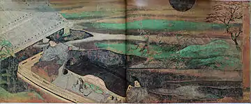 In the top right corner, Murasaki's friend, the maid Saishō no Kimi, is visible.[52] The large garden occupying the left half of the painting and the diagonally positioned building are considered to be a bold scene arrangement.[53] According to Penelope Mason, this is "one of the saddest and most beautiful [scenes] in the scroll", contrasting the beauty of the moonlit garden and pond on the left with the constraints of court life.[52] The latticed shitomi and the stewards separate Murasaki Shikibu from the outside world, keeping her a prisoner in the room.[51][52]