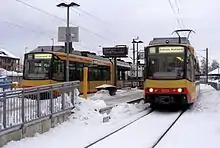 After the occasional long-distance passenger services had been withdrawn in the 1990s, the Murg Valley Railway was integrated into the network of the Karlsruhe Stadtbahn between 2002 and 2004. Since then it has been operated by Albtal-Verkehrs-Gesellschaft (AVG), using their fleet of tram-trains. At Freudenstadt, these meet the services of the Ortenau S-Bahn (OSB), operating over the Kinzig Valley Railway to Offenburg.[2]