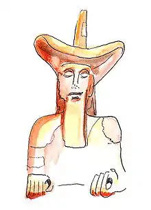 The major piece of the group is a seated terracotta statue with a wide-brimmed hat reminiscent of a cowboy hat.[3] The statue probably represents a haruspex.