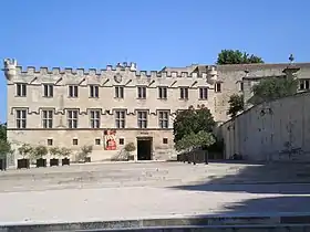 The building suffered during its use from 1396 as a fortified citadel during the Western Schism, and was a wreck by the time the war ended in 1411.[3][2] In the second half of the 15th century, Bishop Alain de Coëtivy and his successor, Giuliano della Rovere (the future Pope Julius II) carried out restoration work, giving the Palace more or less its present appearance by 1503. Della Rovere arrived in Avignon in 1474, having been made bishop of Avignon and papal legate of Avignon by his uncle Pope Sixtus IV. He added new south and west facades in Italian Renaissance style (with oculi, a west-facing door surmounted with a triangular pediment, window drip-moldings and his insignia facing south) and, in 1487, a tower (which collapsed in 1767). The Palace became known as the Palace of the Archbishop when the city was promoted to an archbishopric soon after della Rovere took office.