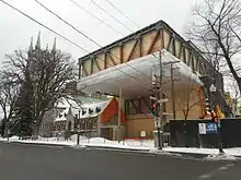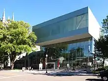 Construction of the Pierre Lassonde Pavilion began in 2013, with the building opened to the public in June 2016.[8] The pavilion has a glass-enclosed access point from Grande Allée to the rest of the museum complex further within Battlefield Park.[13] The Office for Metropolitan Architecture designed the 14,900 square metres (160,000 sq ft) pavilion, with the lead partners being Jason Long and Shohei Shigematsu.[14][15] During the construction of the building, renovations were also undertaken to the museum's tunnel system, transforming them into viewing spaces.[13] The pavilion largely uses glass and steel for its building material, in an effort to foster transparency between the museum and the general public.[13] The building is adjacent to Saint-Dominique Church.[13]