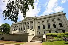 The Gérard-Morisset Pavilion was the first building built for the museum. Work on the building began in May 1928 and was completed in early 1931.[7] Wilfrid Lacroix designed the building in a Beaux-Arts style and Joseph-Émile Brunet sculpted the reliefs on the facade.[10] The building was opened to the public in June 1933.[9] The building features white marble, wide Victorian style steps, and carved ceilings.[11] In 2018, the museum completed renovations of the Gérard-Morisset Pavilion, which saw the brightening of its viewing spaces, as well as harmonizing the structure with the rest of the museum complex.[12]