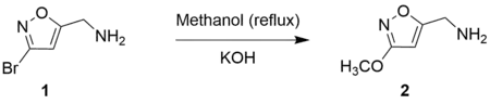 Muscimol was synthesized in 1965 by Gagneux,[26] who utilized a bromo-isoxazole starting material in a two step reaction. 3-bromo-5-aminomethyl-isoxazole (1) was refluxed in a mixture of Methanol and Potassium Hydroxide for 30 hours, resulting in 3-methoxy-5-aminomethyl-isoxazole (2) with a yield of 60%.