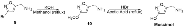 (9) was then refluxed with potassium hydroxide in methanol to generate 5-Aminomethyl-3-methoxyisoxazole (10) with a 66% yield. Subsequent reflux of (10) with hydrobromic acid and acetic acid generated muscimol with a yield of 62%. The overall synthetic yield was 30%.[33]