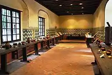 The museum is spread out over ten halls with the intention of explaining the historical processes of each of the military conflicts. It starts with an Introductory Hall at the top of the stairs, which is dedicated to showing the forms of fighting adopted in Mexico and the development of U.S. expansionism. The Hall of Independence contains explanations as to how Mexico gained her independence from Spain to the government of General Guadalupe Victoria from 1810 to 1829. The Spanish Intervention of 1829 Room is dedicated to Spain's attempt to reclaim its former colony as well as U.S. attempts to buy Texas. The room dedicated to the Pastry War (1838–1839), also called the First French Intervention, is dedicated to the conflict between France and Mexico over trade issues and its eventual end through negotiation.[3] The Mexican–American War Room (1846–1848) begins with Mexico's loss of Texas, which then annexed itself to the United States and how conflict over this event eventually led to war between the U.S. and Mexico. It covers how the U.S. invaded Mexican territory and ended with a peace treaty which required Mexico to give up much of its northern territory.[3] Displays include the Texan flag flown at the Alamo and U.S. military maps of the 1847 battle in Churubusco, noting how much the monastery was separated from the city at that time.[2] The (Second) French Intervention in Mexico (1862–1867) is represented in a room which focuses on the role of President Benito Juarez in the conflict. This is then followed by a room dedicated to the "Restored Republic." It focuses on how the interventions up until that time shaped the Republic and how Mexico entered the world market as a supplier of raw materials.[3]
