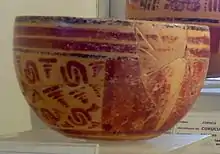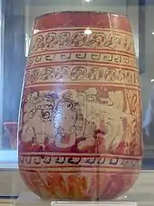 The vase was a drinking vessel for chocolate and depicts a mythological scene featuring the young Moon goddess, who carries a rabbit in her arms.[15] The goddess is seated upon a throne, which is decorated with a celestial band.[15] Below her are three jars of pulque.[15] Only about half of the original scene has survived, and the text next to the goddess is illegible.[15] Only slight traces remain of a second person seated upon the same throne, to the left of the Moon goddess.[15] Two rows of supernatural beings are seated on the floor before the throne, indicating that they are visiting the enthroned principal figures.[16] Three of these visitors can be identified, including two versions of God N, represented as separate individuals, and a being that is a man-bird hybrid.[16] These figures are also accompanied by hieroglyphs, although they are also illegible.[16] The vase includes a dedicatory hieroglyphic text around the rim that identifies it as the drinking vessel of a lord of the city of Naranjo.[16]