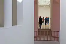 The core of the museum is the legacy of German collector Karl Ströher with 87 works of Pop art and Minimalism. The manufacturer Ströher had originally bequeathed to his native city of Darmstadt on condition that a museum be built to house them. When funds for the project were not approved, Ströher's heirs sold the choice ensemble to Frankfurt and donated the painting "Yellow and Green Brushstrokes" by Roy Lichtenstein to the museum as a gift.[10] Major artists since the 1950s from the Ströher Collection displayed,[11] including Jasper Johns, Robert Rauschenberg, Carl Andre, John Chamberlain, Dan Flavin, Donald Judd, Roy Lichtenstein, Walter de Maria, Robert Morris, Claes Oldenburg, James Rosenquist, Frank Stella, Cy Twombly, Andy Warhol, Tom Wesselman and George Segal, with his Jazz Combo. Between 1981 and 1987, the museum's co-founder Peter Iden[12] expanded the collection by adding works from the seventies and eighties.[13] Later parts of the collection have been amassed by the museum's first director,[14] Jean-Christophe Ammann.[15] In 2006 the Museum für Moderne Kunst, along with the Kunstmuseum Liechtenstein and the Kunstmuseum St. Gallen, acquired the private collection of Cologne art dealer Rolf Ricke, comprising works by Richard Artschwager, Bill Bollinger, Donald Judd, Gary Kuehn, und Steven Parrino. Today, the permanent collection includes over 4,500 works of international art, ranging from the 1960s to the present.[16]