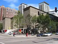 The current location at 220 East Chicago Avenue is in the Streeterville neighborhood of the Near North Side community area.[2] Josef Paul Kleihues designed the current building after the museum conducted a 12-month search, reviewing more than 200 nominations.[3] The museum was originally located at 237 East Ontario Street, which was originally designed as a bakery. The current building is known for its signature staircase leading to an elevated ground floor, which has an atrium, the full glass-walled east and west façades giving a direct view of the city and Lake Michigan.