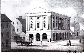 Construction of the building was authorized by the city in 1761 and begun in 1762, but the merchant proprietors ran out of money after finishing just the first level, and the city took the project over, roofing that level. The building was not completed until 1772. As a traditional British style market house (like Boston's Faneuil Hall), the building's first level was an open-air arcade that served as a marketplace for various goods. Profits from the building went into a city fund for the establishment of a granary.[3]