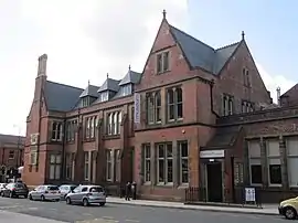 The building which now houses the Museum of Wigan Life was designed by Alfred Waterhouse and opened in 1878 as the town's first public library. Its construction was funded by mill owner Thomas Taylor and Dr Joseph Winnard, who each bequeathed £12,000. Dr Winnard's donation paid for the library's books, and portraits of the benefactors remain on display at the museum. Built on the site of Wigan Grammar School, the library was opened on 7 May 1878. A Grade II listed building,[4][5] the architecture is largely in Elizabethan Revival style, embellished by some Gothic features such as its red brick arches.[6]