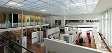 The light is carefully filtered before flooding inside the building. To the east, opal glass panes attenuate the rays of the morning sun. The facade to the west has three levels of filtration: a wall of glass screens on which horizontal lines have been printed intersects with the vertical lines of pivoted louvers, creating a grid of variable density. When light rays enter horizontally, blinds complete this scheme. On the ceiling, translucent square tiles filter the light reflected by the louver installed above the roof. Inclined blades break the sun and deliver a soft luminosity to the heart of the building.[4]