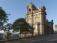 The Bank of Scotland Head Office building is a large Baroque Revival building topped with a dome which sits at the top of The Mound. The original building was designed in the Palladian style by Richard Crichton and Robert Reid and erected 1801-6, later altered by David Bryce in 1863 and by Peddie and Kinnear in 1878. Because of its location on a steep slope, it has an extensive basement area, part of which now houses the Museum on the Mound.[2]