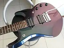 The JPX, introduced 2010, is a variant of the John Petrucci signature model, commemorating the ten-year collaboration with Petrucci. The new body shape has a slightly thinner upper horn and a more symmetric bridge end profile. The body is also chambered for added acoustic resonance.