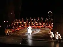 The Paris Opera, officially called the Opéra National de Paris founded in 1669, is the oldest and most famous opera company of France. It mainly produces operas at its modern 2700-seat theatre Opéra Bastille which opened in 1989, and ballets and some classical operas at the older 1970-seat Palais Garnier which opened in 1875. Small scale and contemporary works are also staged in the 500-seat Amphitheatre under the Opéra Bastille. The company's annual budget is in the order of 200 million euros, of which 100 million come from the French state and 70 million from box office receipts.[1] With this money, the company runs the two houses and supports a large permanent staff, which includes the orchestra of 170, a chorus of 110 and the corps de ballet of 150.[2] Each year, the Opéra presents about 380 performances of opera, ballet and other concerts, to a total audience of about 800,000 people (of whom 17% come from abroad), which is a very good average seat occupancy rate of 94%.[2] In the 2012/13 season, the Opéra presented 18 opera titles (two in a double bill), 13 ballets, 5 symphonic concerts and two vocal recitals, plus 15 other programmes. The company's training bodies are also active, with 7 concerts from the Atelier Lyrique and 4 programmes from the École de Danse.[3]