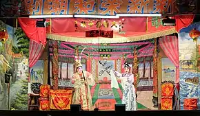 There are speakers of various dialects amongst the Chinese population, such as Hokkien, Hakka, Cantonese, and Teochew, and different dialect speakers may have their own clan associations which support their respective forms of opera. Opera troupes were first formed by amateur music clubs; the earliest amateur music club in Singapore is the Er Woo Amateur Music & Dramatic Association (馀娱儒乐社) set up in 1912 by Teochew businessmen, initially to promote music of the Hakkas (Hanju opera and Handiao music), later also Teochew opera.[13] A number of recordings of Hanju opera performed by Er Woo were made in the 1920s and 1930s. Many professional and amateur opera troupes that performed in various dialects were later established.[14] These opera troupes typically perform during festivals and national events, and may also hold regular small-scale performances, or large-scale ones annually or biannually.[15] The professional troupes may also perform in opera theatres.[16] During Chinese festivities there was also a minstrel tradition called zouchang (walk-sing), which involves walking performance by members of the operatic troupes. In the past, makeshift stages often appeared during festivities along the streets where operas may be performed. However, operas have declined as popular entertainment in the latter half of the 20th century; opera theatres closed, and street opera have mostly been replaced by getai where modern songs and comedy routines are performed,[1] although street opera is still performed by professional and amateur opera troupes.[16]