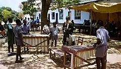 The mbira is an integral part of Zimbabwean music.[2][3] Classified by musicologists as a lamellaphone, part of the plucked idiophone family, it is created from things found in nature such as a wooden board (often fitted with a resonator) and tines. It is frequently played in a deze (calabash resonator) which amplifies the sound and augments using shells or bottle caps placed around the edges. Often accompanied by the hosho, a percussion instrument, the mbira is often an important instrument that people play at religious ceremonies, weddings, and other social gatherings. The mbira plays a central role in the traditional Bira ceremony used to call on ancestral spirits.[3]