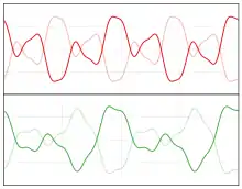 Whenever two different pitches are played at the same time, their sound waves interact with each other – the highs and lows in the air pressure reinforce each other to produce a different sound wave. Any repeating sound wave that is not a sine wave can be modeled by many different sine waves of the appropriate frequencies and amplitudes (a frequency spectrum). In humans the hearing apparatus (composed of the ears and brain) can usually isolate these tones and hear them distinctly. When two or more tones are played at once, a variation of air pressure at the ear "contains" the pitches of each, and the ear and/or brain isolate and decode them into distinct tones.