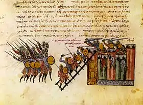 In late 842 or 843, with Neapolitan support, the Muslims conquered Messina.[78][79] In 845, the fortress of Modica also fell, while the Byzantines, now at peace with the Abbasid Caliphate, received reinforcements from the eastern theme of Charsianon. The two armies met near Butera, where the Byzantines suffered a crushing defeat, losing about 10,000 men.[80] In the wake of this disaster, the Byzantine position deteriorated rapidly: al-Fadl ibn Ja'far took Leontini by a ruse in 846,[81] and the fortress of Ragusa followed in 848, when its garrison was forced by severe famine to surrender to the Muslims, who razed the fortress.[82] At about the same time (late 847 or 848), an attempt by the Byzantine fleet to land troops near Palermo failed, and subsequently the Byzantines lost seven out of their ten ships in a storm.[82]