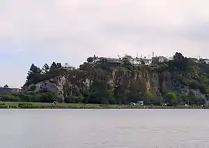 The northern side of the Musselburgh Rise is skirted by another main thoroughfare, Portobello Road. This road joins with the southern end of Portsmouth Drive close to the northeastern point of the rise, and continues across the causeway at Andersons Bay Inlet, though the junction is a limited one, and traffic may not turn right from the Musselburgh part of Portsmouth Drive to continue across the causeway. Close to the junction is a large memorial stone to the Taranaki Māori prisoners of the New Zealand Wars who were transported south to Dunedin, many of whom constructed the causeway and much of Dunedin's foreshore roads as forced labour.[3] A branch railway ran along Portobello Road in this area from the 1870s until 1912, and rail links continued to the suburb until the track were lifted in 1928.[4]