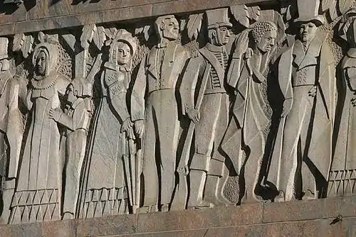 Around the three sides of the building facing Darling Street, Parliament Street and Longmarket Street there is a 386 feet (118 metre) frieze depicting scenes from the colonial history of South Africa, reported at its completion to be the longest such frieze in the world.[4]