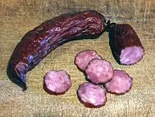 Kielbasa Myśliwska (Hunter's sausage) is a type of Kielbasa (Polish sausage). Lightly smoked and dried, its ingredients are pork, salt, pepper, and juniper. It is typically around 10 centimetres (4 inches) long and 2.5 cm (1 in) in diameter. At least one brand, made in Poland but sold in the UK, contains beef as well as pork.