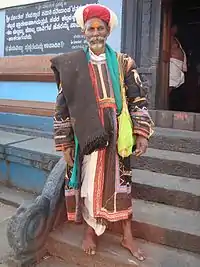 The gorava dance (goravara kunita), a dance of the Shiva cult, is popular in areas of North Karnataka. The goravas[4] worship Mylara linga (Shiva), wear the costume of a black woolen rug, on shoulder hanging bag made out of skin. Some of them wear a black coat and white dhoti. In traditional contexts, the gorava devotees who dance in trance sometimes bark like dogs. It is believed that the totem of the Mylaralinga is a dog. The dancers' feet move in clockwise and zigzag forms. Gorava wears yellow powder on his forehead and gives it to his believed devotees. Artists holds instruments, like damaru (percussion), or sometime holds kolalu (flute), and a few artists wear a small bronze bell on their shoulders. A few followers hold cowbells called paarigante.