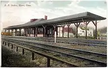 The New Haven, New London and Stonington Railroad opened from Stonington to Groton in December 1858 and was shortly thereafter acquired by the New York, Providence and Boston Railroad.[2] A wooden depot, similar to those still extant at West Mystic and Noank, was constructed.[3] The station burned on July 4, 1866 due to Independence Day celebrations; it was soon replaced.[4]