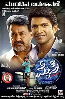 Mythri (transl. Friendship) is a 2015 Indian Kannada-language social drama film written and directed by B. M. Giriraj and produced by N. S. Rajkumar under the banner of Omkar Movies.[1] It stars Mohanlal and Puneeth Rajkumar in extended cameo roles, and features Adithya Bharadwaj, Archana, Atul Kulkarni, and Bhavana in substantial roles.[2][3] Ilaiyaraaja scored the music for the film and Krishna Kumar handled the cinematography.[4] The film is a social drama, and also focuses on relationships in the time of liberalisation.[4]