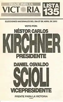 Carlos Menem ran for a new term as president in 2003, and Eduardo Duhalde tried to prevent it. Instead of holding primary elections within the PJ, the 2003 elections used a variant of the Ley de Lemas.[32] All the Peronist candidates were allowed to run in the general election, using their own tickets. Although Kirchner ran for president with Duhalde's support, he was not the president's first choice. Trying to prevent a third term for Menem, Duhalde approached Santa Fe governor Carlos Reutemann and Córdoba governor José Manuel de la Sota; Reutemann declined, and De la Sota did not run because he was insufficiently popular. Duhalde also unsuccessfully approached Mauricio Macri, Adolfo Rodríguez Saá, Felipe Solá, and Roberto Lavagna, all of whom refused to run. Duhalde initially resisted supporting Kirchner, fearing that Kirchner would ignore him if elected.[33] Kirchner run on the Front for Victory ticket, one of the several fronts put up by the PJ. Since Kirchner was identified with the centre-left, Duhalde appointed the centre-right Daniel Scioli as his vice-presidential candidate.[34] Only a handful of Peronist governors supported either candidate; most remained neutral, awaiting the election to forge a relationship with the victor.[35]