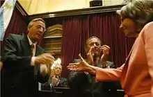Kirchner soon distanced himself from Duhalde, removing those close to the former president from the government to reduce his political influence. He also sought supporters across the social and political spectrum to counter Duhalde's influence in the party. Although Duhalde was not initially against Kirchner, Kirchner tried to prevent the presence of alternative leaderships within the PJ.[86] However, they put their differences behind them during the October 2003 legislative elections.[87] Their dispute was fanned by the political weight of Buenos Aires province (the most populous in Argentina, with almost 40 percent of the national vote),[88] and continued through the 2005 midterm elections. Without consensus in the PJ for a candidate for senator in the Buenos Aires province, both leaders had their wives run for office: Hilda González de Duhalde for the PJ and Cristina Fernández de Kirchner for the Front for Victory, which contested the election as a different party.[89] Cristina Kirchner won the election.[90] As in 2003, the elections were defined by Peronist factions; the opposition parties could not put up a united national front.[91] The victory gave Kirchner the confidence to remove Lavagna, Rafael Bielsa, Jose Pampuro, and Alicia Kirchner from his cabinet and replace them with ministers who, though less well-known, had perspectives closer to his own.[65]