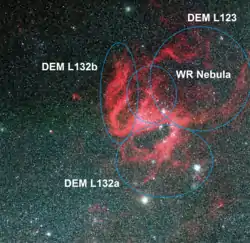 DEM L132a is 88 parsecs across and encompasses the two luminous blue variables S Doradus and R85. However, those stars do not emit sufficient ionising radiation to produce the observed shell, and no other hot luminous stars are seen within the shell. It may have been produced by one or both of the LBVs during an earlier phase of their evolution. DEM L132b is 52 parsecs wide and surrounds two class O giants or supergiants and numerous other hot stars, which comfortably produce the necessary ionising radiation and fast winds to sculpt the bubble from the surrounding interstellar material. The WR bubble nebula is a similar size to DEM L132b and is produced by Brey 21, a binary containing a WN3 star and a B-type supergiant. DEM L123 is 158 parsecs across and its origins are unclear. No sufficiently powerful stars have been detected inside it that could produce it with their stellar wind (as this would require the power of 44 O6 supergiants) and it is ten times too energetic to have originated from a typical supernova. This bubble may have been created by a hypernova.[2]