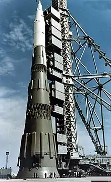 The N1/L3 (from Ракета-носитель Raketa-nositel', "Carrier Rocket"; Cyrillic: Н1)[4] was a super heavy-lift launch vehicle intended to deliver payloads beyond low Earth orbit. The N1 was the Soviet counterpart to the US Saturn V and was intended to enable crewed travel to Earth's Moon and beyond,[5] with studies beginning as early as 1959.[6] Its first stage remains the most powerful rocket stage ever built,[7] but all of the four flown N1 Block A first stages failed because of a lack of static test firings that did not reveal plumbing issues and other adverse characteristics with the large cluster of thirty engines and its complex fuel and oxidizer feeder system.[8]