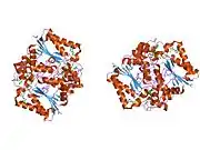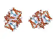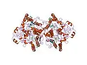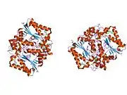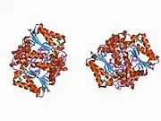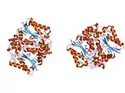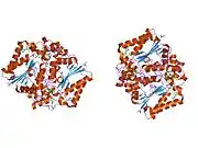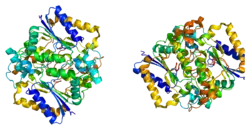 NAD(P)H dehydrogenase [quinone] 1 is an enzyme that in humans is encoded by the NQO1 gene.[5] This protein-coding gene is a member of the NAD(P)H dehydrogenase (quinone) family and encodes a 2-electron reductase (enzyme). This FAD-binding protein forms homodimers and performs two-electron reduction of quinones to hydroquinones and of other redox dyes. It has a preference for short-chain acceptor quinones, such as ubiquinone, benzoquinone, juglone and duroquinone.[6] This gene has an important paralog NQO2. This protein is located in the cytosol.[7]