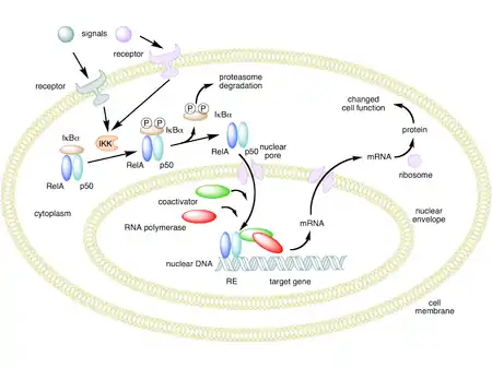 NF-κB (nuclear factor kappa-light-chain-enhancer of activated B cells) is a protein complex that controls transcription of DNA, cytokine production and cell survival. NF-κB is found in almost all animal cell types and is involved in cellular responses to stimuli such as stress, cytokines, free radicals, heavy metals, ultraviolet irradiation, oxidized LDL, and bacterial or viral antigens.[1][2][3][5][6] NF-κB plays a key role in regulating the immune response to infection. Incorrect regulation of NF-κB has been linked to cancer, inflammatory and autoimmune diseases, septic shock, viral infection, and improper immune development. NF-κB has also been implicated in processes of synaptic plasticity and memory.[7][8][9][10][11][12]