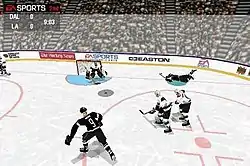 Reviews especially praised the advanced AI,[5][7][10][14] fast gameplay,[5][9][10][14] and the ability to change team strategies on the fly, without going to a pause menu.[5][7][9][14] IGN pointed out that thanks to this last feature, "It only takes a little while for those who don't even care about strategy to experiment with new offenses and defenses that match their playing style. This changes the whole way hockey strategy is used."[9] Glenn Rubenstein added in GameSpot, "Features like these make the game move faster than any other hockey title out there, and they also give the game a thrilling edge that others lack."[7] Critics also praised the sound effects[9][10][14] and the graphics, especially the player animations.[5][7][9][10][14] While some criticized that the controls are a bit loose,[5][14] most critics praised the controls,[7][9][10] with Next Generation arguing that "since the players are on ice, EA's slippery control is actually quite accurate."[10]