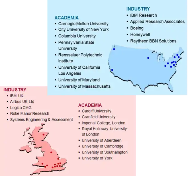 The ITA consistses of several research laboratories and universities in U.S. and UK. These included the U.S. Army Research Laboratories and the UK Defense Science and Technologies as participating Government research laboratories. The non-government members of the alliance in both countries consisted of both industrial and academic research organizations as listed below: