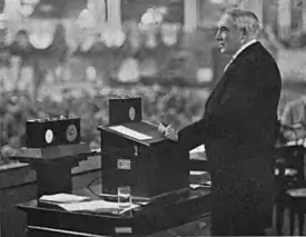 Members of Congress soon became involved. On February 10, 1922, Representative John L. Cable of Ohio gave a short speech on "Abraham Lincoln, the Congressman".[5] The first U.S. senator to make a broadcast over the station was Henry Cabot Lodge of Massachusetts, who was followed on March 30 by Senator Harry New of Indiana, who made a campaign speech directed toward his supporters in Indianapolis.[6] New's partisan speech immediately stirred up controversy about the propriety of using a government station for political reasons,[7] and in early April Secretary of the Navy Edwin Denby announced an end to all political broadcasts over government radio stations.[8] The ban was expanded to eliminate almost all spoken word broadcasts, including nonpartisan talks by government employees, pending an official review of what standards should be adopted.[9] Secretary Denby initially authorized an exception giving approval to broadcast the dedication of the National Woman's Party headquarters on May 22, which would have been carried by both NOF and NAA.[10] But just prior to the event Acting Secretary of the Navy Theodore Roosevelt, Jr. stepped in to deny permission for the broadcast, ruling it was too political.[11]